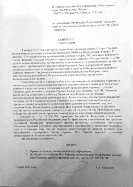 Заявление в Следственный комитет РФ с требованием возбудить уголовное дело в отношении Гиркина написал адвокат Аркадий Чаплыгин после признаний боевика в расстрелах провинившихся «ополченцев».
