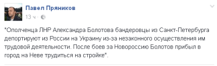 "Ополченца ЛНР Александра Болотова бандеровцы из Санкт-Петербурга депортируют из России в Украину из-за незаконного осуществления им трудовой деятельности. После боев за "Новороссию" Болотов прибыл в город на Неве трудиться на стройке", - написал он.