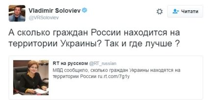 Отметим, что известный пропагандист политики президента России Владимир Соловьев процитировал в соцсетях её слова и попробовал съязвить, написав: "А сколько граждан России находится на территории Украины? Так и где лучше?".