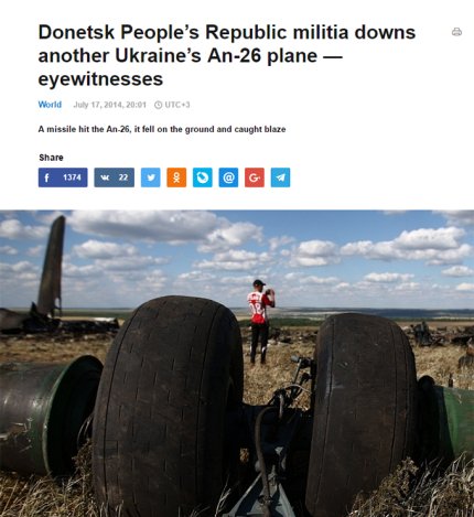Российское государственное информационное агентство до сих пор не удалило новость о том, как боевики так называемой ДНР хвастались о якобы сбитом украинском самолете АН-26 на Донбассе в 2014 году, в то время как по факту был сбит Boeing 777 рейса МН17.