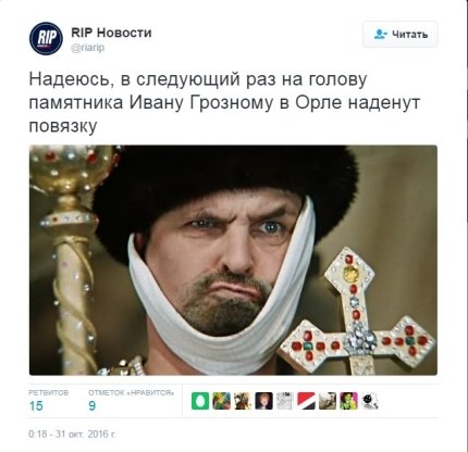 В России в Орле неизвестные поглумились над скандальным памятником кровавому царю Ивану Грозному, надев ему на голову мешок.