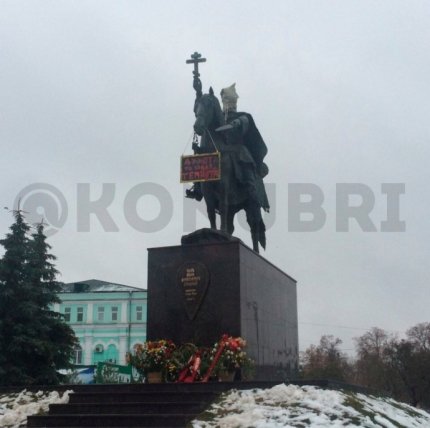 Также на голову коня прикрепили черную табличку с красной надписью: "Духота-то какая, темнота".