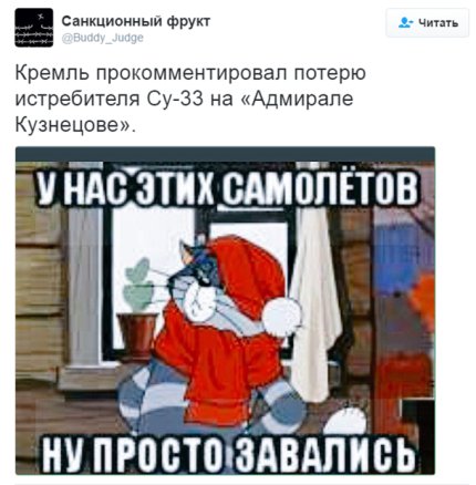 «Реджеп Таип Эрдоган уничтожил один наш самолет. "Адмирал флота Кузнецов" – два», - пишет в Twitter российский журналист Аркадий Бабченко.
