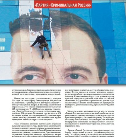 В России оппозиционный политик Илья Яшин представил доклад под названием "Партия "Криминальная Россия", в котором рассказывается о российских политиках, членах "Единой России", которые либо уже осуждены за разного рода преступления, либо могут быть причастны к преступлениям, но официально обвинений им не предъявлялось.