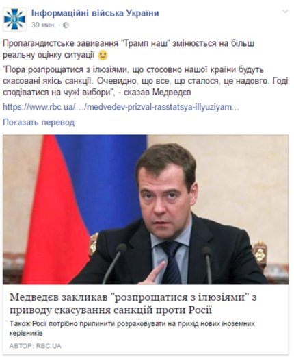В сообществе «Інформаційні війська України» метко прокомментировали заявление российского премьера Дмитрия Медведева о том, что россияне не должны надеяться на отмену санкций Запада из-за избрания президентом США Дональда Трампа.