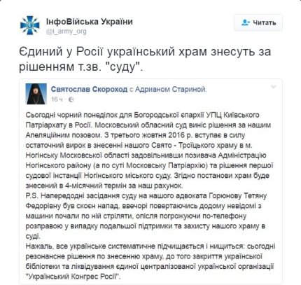 "Сегодня черный понедельник для Богородской епархии УПЦ Киевского Патриархата в России. Московский областной суд вынес решение по нашему апелляционному иску. С 3 октября 2016 вступает в силу окончательный приговор в сносе нашего Свято-Троицкого храма в г. Ногинске Московской области, удовлетворив истца - Администрацию Ногинского района… и решение первой судебной инстанции Ногинского городского суда. Согласно постановлению храм будет снесен в 4-месячный срок за наш счет", - написал он.