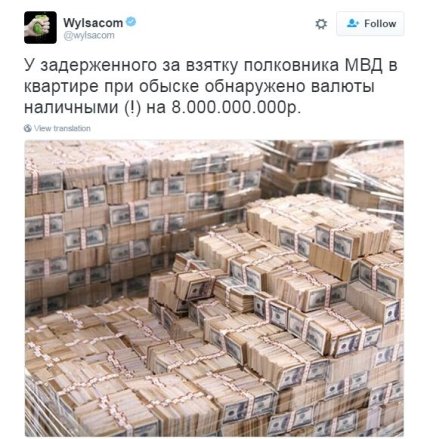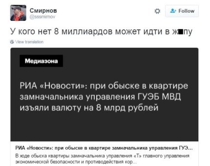 "Мы в восхищении! Как говорил Бегемот. Сразу скажу, это не антироссийский пост. Это пост преклонения перед борцами с коррупцией. Это ж как надо брать! Двумя руками и ногами! Круглосуточно! Вот это борец! Борцун! Чистые руки, горячее сердце, холодная голова!"