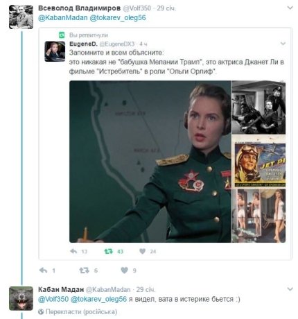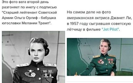 Россияне придумали, что бабушкой югославки Меланьи Трамп является летчица, дважды героиня, старший лейтенант армии СССР, однако в сети опровергли эту информацию, доказав, что на фото была изображена американская актриса Джанет Ли, сыгравшая советскую летчицу в фильме "Jet Pilot" в 1957-ом году.