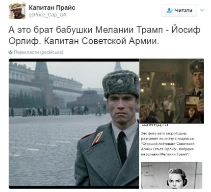 Также в сети обнародовали фото Арнольда Шварценеггера в образе капитана милиции Ивана Данко из фильма "Красная жара", и пошутили, что он якобы является капитаном Советской Армии, братом бабушки Мелании Трамп Иосифом Орлифом.