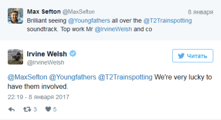 Писатель Ирвин Уэлш, на книгах которого основаны фильм «На игле» и его сиквел «Трейнспоттинг 2», подтвердил аутентичность треклиста в своем Twitter.