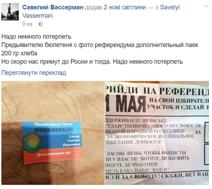 В то же время, луганский блогер Савелий Вассерман добавил: "Надо немного потерпеть. Предъявителю бюллетеня с фото референдума дополнительный паек 200 гр хлеба. Но скоро нас примут до России и тогда. Надо немного потерпеть".