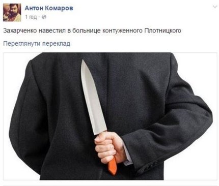 "Захарченко навестил в больнице контуженного Плотницкого", - написал украинский блогер Антон Комаров, сопроводив фразу фотографией мужчины с ножом за спиной.