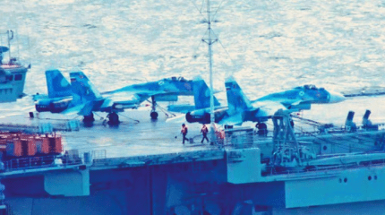 Кроме того, стало известно, что на борту авианосца находятся истребители Су-33, а также ударные вертолеты Ка-52, которые время от времени выкатывают на палубу судна.