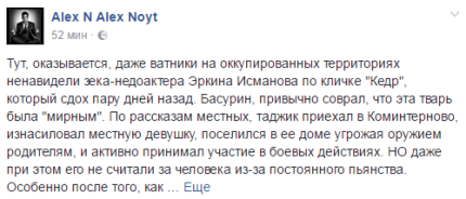 "По рассказам местных, таджик (Исманов был российским гражданином таджикского происхождения – Ред.) приехал в Коминтерново, изнасиловал местную девушку, поселился в ее доме, угрожая оружием родителям, и активно принимал участие в боевых действиях", - рассказал автор.