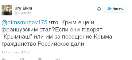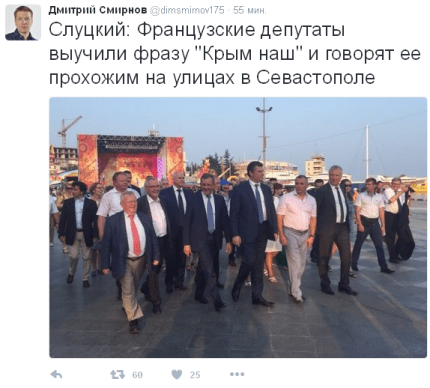 «Слуцкий: Французские депутаты выучили фразу "Крым наш" и говорят ее прохожим на улицах в Севастополе», — написал он, приводя слова депутата российской Госдумы от фракции ЛДПР Леонида Слуцкого.
