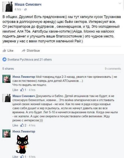 "Субботнее утро для киевского сообщества выдалось оживленным. Какая-то Маша Симович сообщила, что "цапнула" кусок Труханова острова и собирается "на майских поднять денег". При этом в комментариях излагает свои мысли о детяхаАТО-шников и о "хазарьё". Мы срочно выясним и в Киевсовете, и в Киевземе, шла ли речь в последнее время о выделении земли на Трухановом", - написал Сергей Гусовский.