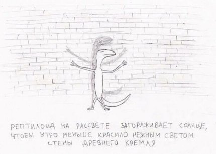"Рептилоид на рассвете загораживает солнце, чтобы утро меньше красило нежным светом стены древнего Кремля", - подписана картинка.