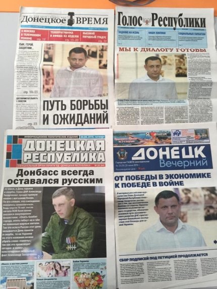На снимке видны и заголовки газет. Так, «Донецк вечерний» - «От победе в экономике – к победе в войне», «Донецкое время» разместило передовицу «Путь борьбы и ожиданий», «Голос республики» - «Мы к диалогу готовы», «Донецкая республика» - «Донбасс всегда оставался русским». Все эти статьи иллюстрируются большим портретом Захарченко.
