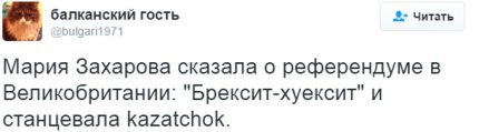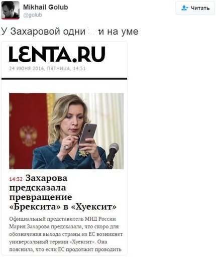Официальный представитель МИД России Мария Захарова заявила в связи с референдумом в Великобритании, что скоро для обозначения выхода страны из ЕС появится универсальный термин «Whoexit» (от английского «whoever», «кто угодно»), при этом в соцсетях стали активно иронизировать над словами Захаровой.