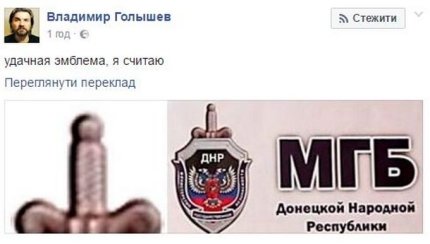 На эмблеме "МГБ" ДНР изображен щит с двуглавым орлом на фоне флага группировки, а также меч. Однако меч стоит позади щита, и потому видно только его эфес, очертания которого напоминают мужской половой орган. "Удачная эмблема, я считаю", - прокомментировал её Владимир Голышев.