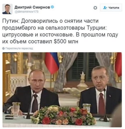 "Сегодня правительство РФ приняло решение допустить на российский рынок целую группу турецких товаров – товары сельхозпроизводства: косточковые так называемые и цитрусовые продукты, - сказал Путин. - Российское сельское хозяйство не производит таких продуктов, а поступление на рынок турецких может привести — и мы на это рассчитываем — к снижению цен на эти продукты".