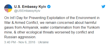 "В Международный день предотвращения эксплуатации окружающей среды в войне и вооруженных конфликтах мы все еще обеспокоены вредными газами в Армянске, загрязнением воды из шахты "Юнком" и другими экологическими угрозами, вызванными конфликтом и российской агрессией", - сказано в сообщении.