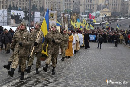 Люди прошли маршем от Европейской площади через Майдан Независимости и Алею Небесной сотни, неся цветы, лампадки и фотографии погибших участников Революции Достоинства. Возле Мемориала память погибших почтили минутой молчания, а после панихиды возложили цветы.