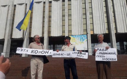 В руках у троих участников пикета были плакаты с надписями: «Пятая колонна», «Рабы, подножки, грязь Москвы», в руках одного из протестующих был украинский флаг.