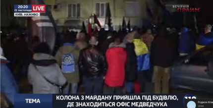 Отмечается, что на Майдане Независимости прошло народное "Вече" в рамках празднования третьей годовщины Евромайдана, большая часть участников которого отправилось "мирным шествием" к офису Медведчука.
