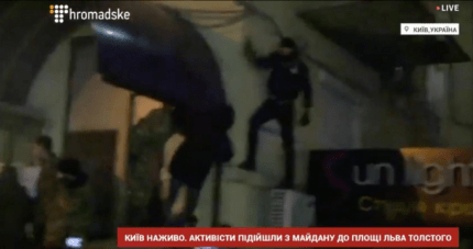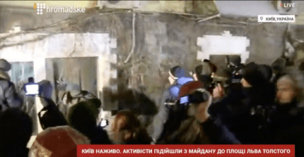 "По нашей информации, в доме, к которому пришли люди, находятся офисные помещения Медведчука. Несколько минут назад пришла колонна с Майдана во главе с Кохановским, он призвал протестующих бить окна, ломать роллеты, однако отметил, чтобы не касались машин. Протестующие держат в руках флаги "ОУН", "Правого сектора" и "Белого молота". Здесь также зажгли файера. Работают около 150 правоохранителей, около 200 нацгвардейцев и пожарная машина", - говорится в сообщении.