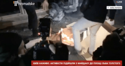 Активисты, которые ранее подожгли покрышки на Майдане Независимости в Киеве, отправились к офису лидера "Украинского выбора", кума президента России Владимира Путина Виктора Медведчука и устроили погромы.