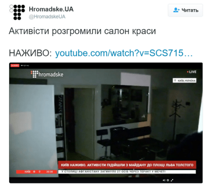Отметим, что позже в сети появилась информация, что на самом деле активисты разгромили салон красоты, а не офис украинского политика.