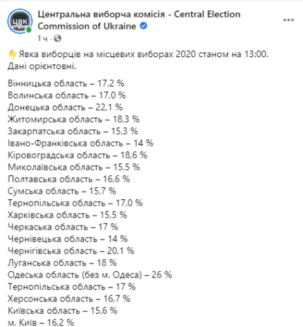 По данным ЦВК, на данный момент самая высокая явка на выборах зафиксирована в Одесской области, самая низкая - в Ивано-Франковской и Черновицкой областях.