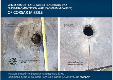 "Результаты испытания новейшего украинского легкого переносного ракетного комплекса "Корсар": сквозное пробитие бронеплиты толщиной 50 мм осколочно-фугасною боевой частью (калибр 105 мм) ракеты "Корсар", - говорится сообщении.