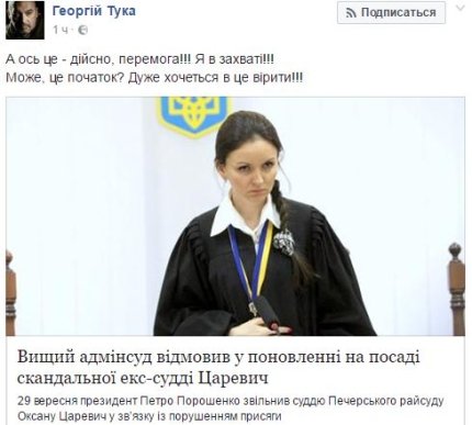 Ранее сообщалось, что 29 сентября Президент Петр Порошенко уволил Царевич за нарушение присяги при вынесении решений против активистов Евромайдана.
