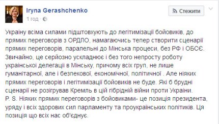 "Украину всеми силами подталкивают к легитимизации боевиков к прямым переговорам с ОРДЛО, пытаясь теперь создать сценарии прямых переговоров, параллельные Минску процессы, без РФ и ОБСЕ. Конечно, это серьезно осложняет и без того непростую работу украинской делегации в Минске", - написала Геращенко.