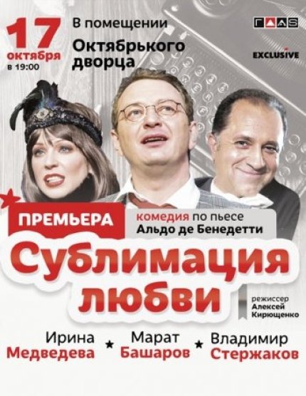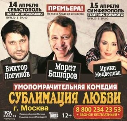 Тем временем в продаже появились билеты на представление "Сублимация любви" с участием Марата Башарова, Владимира Стержакова и Ирины Медведевой. Билеты стоят от 200 до 1350 гривен.