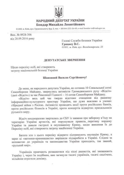 Он также обнародовал депутатский запрос нардепа Михаила Бондаря к СБУ, в котором он просит обратить внимание на гастроли россиян-крымнашистов в Киеве.