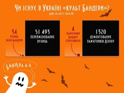 "Из более 50 тысяч переименованных в рамках декоммунизации улиц, площадей и других объектов топонимики, лишь 34 назвали в честь Степана Бандеры", — говорится в сообщении.