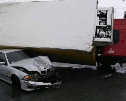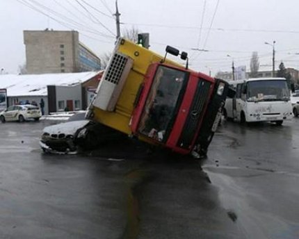 Около 12:00 на перекрестке улиц Максима Шимко и Лебединского грузовик Mercedes столкнулся с легковым автомобилем BMW, после чего перевернулся, придавив его. В результате происшествия водитель автомобиля BMW получил травмы ног.