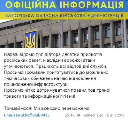 Утром 16 декабря глава Запорожской ОВА Александр Старух официально сообщил о 15 попаданиях российских ракет. По его словам, последствия атаки оккупантов пока уточняются.