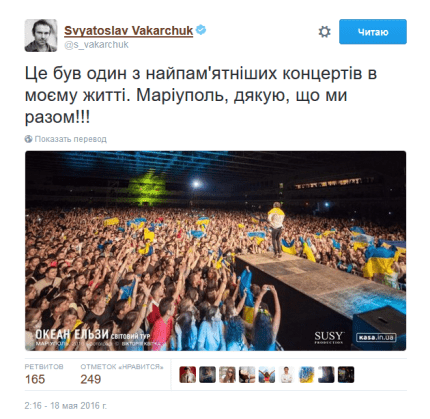 "Это был один из самых памятных концертов в моей жизни. Мариуполь, спасибо, что мы вместе!!!", - написал фронтмен группы "Океан Эльзы".