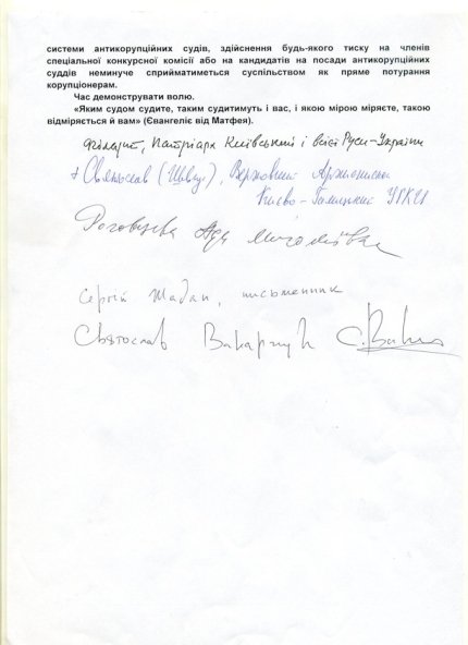 Отмечается, что данное обращение подписали патриарх Киевский и всей Руси-Украины Филарет, Верховный архиепископ Киево-Галицкий Святослав (Шевчук), лидер группы "Океан Эльзы" Святослав Вакарчук, актриса Ада Роговцева и писатель Сергей Жадан.