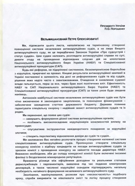 передал президенту Украины Петру Порошенко письмо с призывом создать систему независимых антикоррупционных судов.