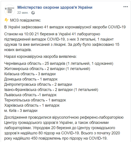 Следует добавить, что по состоянию на 21 марта в мире заболели коронавирусом 276665 человека. Число смертей от инфекции возросло до 11419, при этом 91954 пациентов с COVID-19 медикам удалось вылечить. В Украине на сегодняшний день зафиксировано 41 случай заражения коронавирусной инфекцией — 25 в Черновицкой области, 3 в Киеве, 2 в Житомирской области, 3 в Киевской области, 2 в Днепропетровской области, 1 во Львове, 2 в Ивано-Франковской области, 1 в Харьковской области, 1 в Донецкой области.