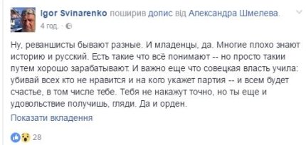 Пользователи соцсетей прокомментировали заявление Шмелёва. Так, Andrey Tarakanov написал: "В последние несколько лет до меня дошла вся глубина известного, пардон, анекдота про "-Пойду постреляю. -А если тебя? - А меня-то за что???".