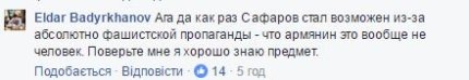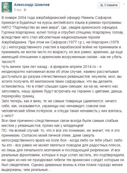 "В январе 2004 года азербайджанский офицер Рамиль Сафаров приехал в Будапешт на курсы английского языка в рамках программы НАТО "Партнёрство во имя мира", где, увидев армянского офицера Гургена Маргаряна, купил топор и отрубил спящему Маргаряну голову, вследствие чего стал абсолютным национальным героем Азербайджана. При этом ни Сафаров (1977 г.р.), ни Маргарян (1978 г.р.) непосредственного участия в карабахской войне не принимали и принимать не могли чисто по возрасту, но все равно: армянин, да еще имеющий отношение к армянским вооруженным силам - как не убить такого?!", - написал Шмелёв.