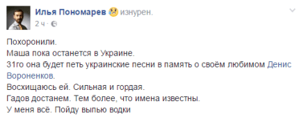 "Похоронили. Маша пока останется в Украине. 31го она будет петь украинские песни в память о своём любимом Денисе Вороненкове", - сообщил он.