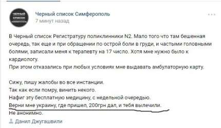 Пользователь опубликовал сообщение крымчанина, который рассказал, что, страдая от острой боли в груди и головных болей хотел пойти на прием к кардиологу, но в результате добился лишь записи на прием к терапевту через неделю.