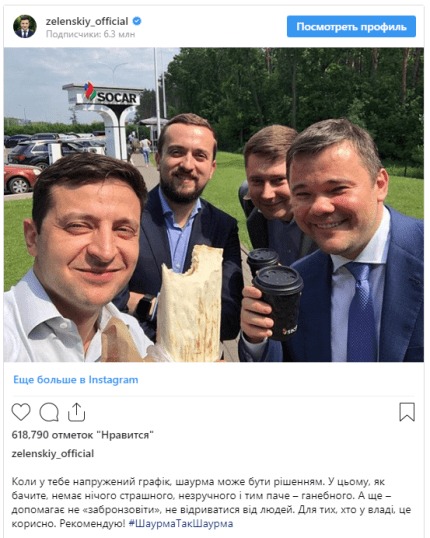 Украинский лидер Владимир Зеленский опубликовал фото, на котором он изображен с шаурмой в руке. На снимке присутствует также его команда. Что интересно, всего за полчаса публикация набрала более 500 тысяч лайков в Instagram главы государства, передает ONLINE.UA.